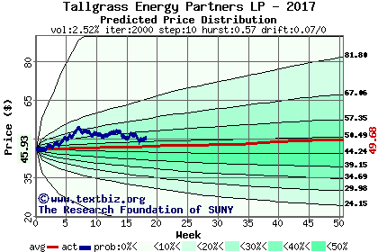 The high to date and low to date prices of the stock plotted against a random walk model for 2017 (what's this?).
