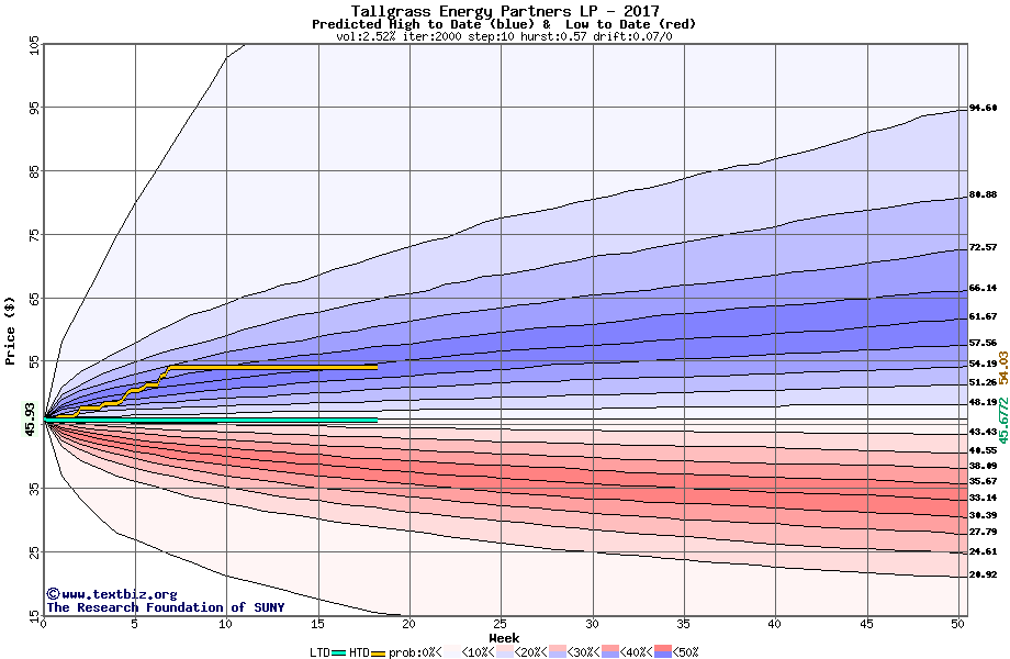 The following graph plots the year-to-date performance of the stock for 2017 compared to the probability calculated by a random walk model.