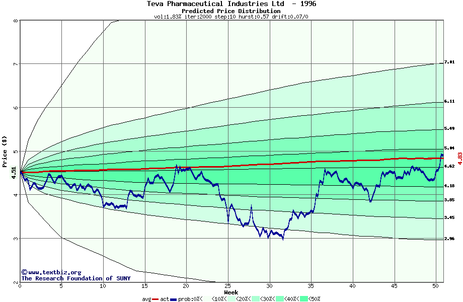 The following graph plots the year-to-date performance of the stock for 1996 compared to the probability calculated by a random walk model.