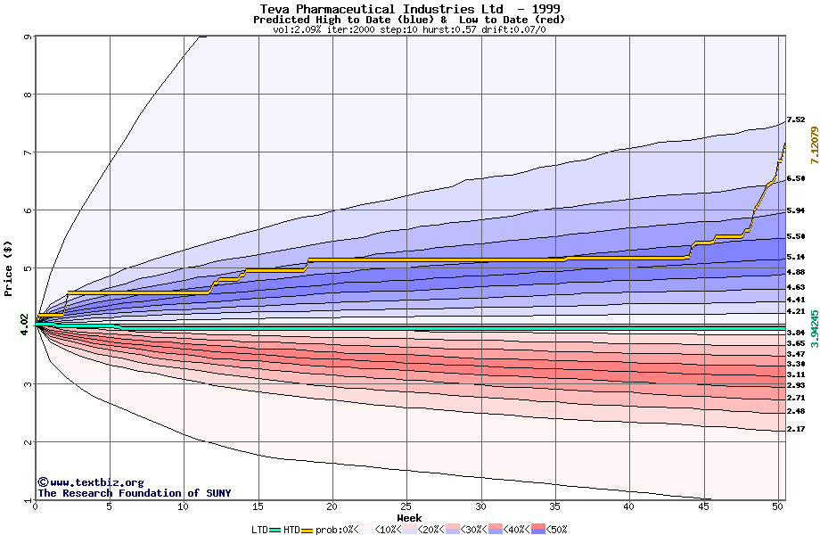 The high to date and low to date prices of the stock plotted against a random walk model for 1999 (what's this?).