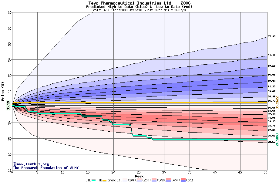 The high to date and low to date prices of the stock plotted against a random walk model for 2006 (what's this?).