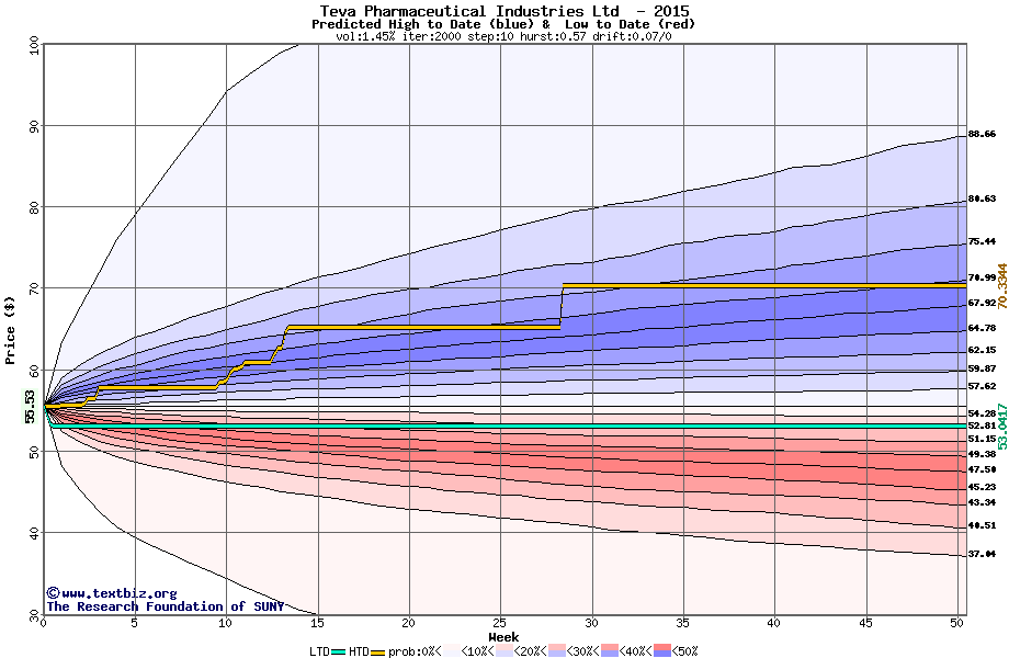 The high to date and low to date prices of the stock plotted against a random walk model for 2015 (what's this?).