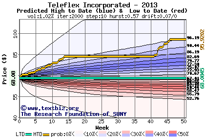The high to date and low to date prices of the stock plotted against a random walk model for 2013 (what's this?).