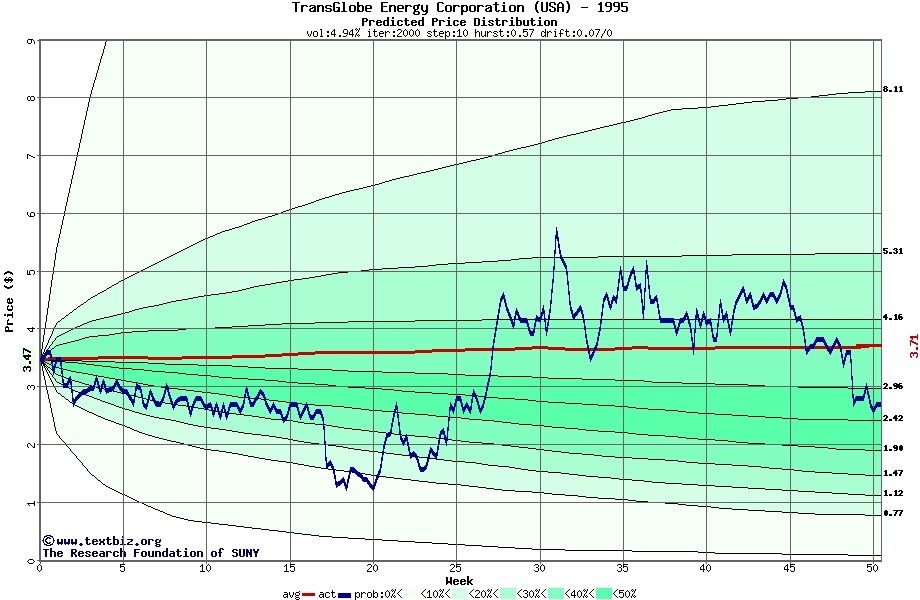 The following graph plots the year-to-date performance of the stock for 1995 compared to the probability calculated by a random walk model.