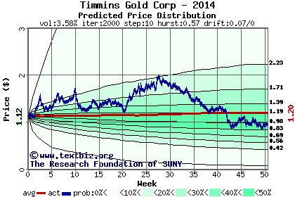 The high to date and low to date prices of the stock plotted against a random walk model for 2014 (what's this?).