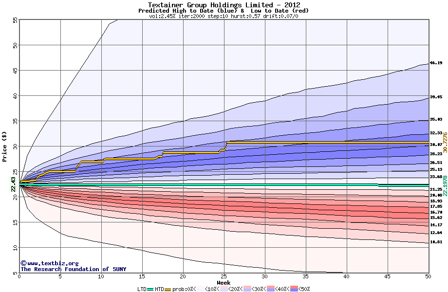 The following graph plots the year-to-date performance of the stock for 2012 compared to the probability calculated by a random walk model.