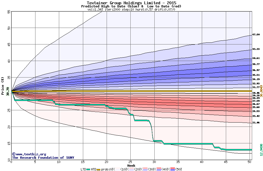 The following graph plots the year-to-date performance of the stock for 2015 compared to the probability calculated by a random walk model.