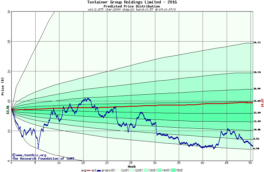 The following graph plots the year-to-date performance of the stock for 2016 compared to the probability calculated by a random walk model.