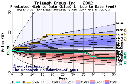 The high to date and low to date prices of the stock plotted against a random walk model for 2002 (what's this?).