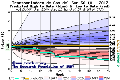 The high to date and low to date prices of the stock plotted against a random walk model for 2012 (what's this?).
