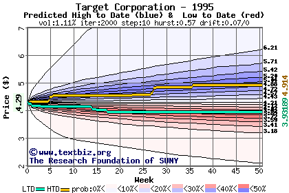 The high to date and low to date prices of the stock plotted against a random walk model for 1995 (what's this?).