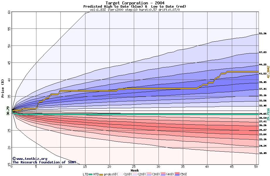 The high to date and low to date prices of the stock plotted against a random walk model for 2004 (what's this?).