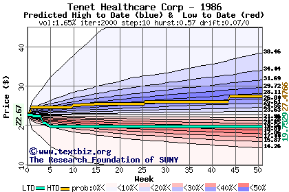 The high to date and low to date prices of the stock plotted against a random walk model for 1986 (what's this?).