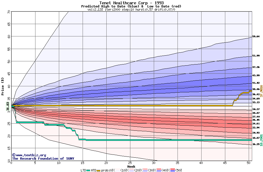 The high to date and low to date prices of the stock plotted against a random walk model for 1993 (what's this?).