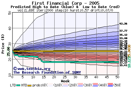 The high to date and low to date prices of the stock plotted against a random walk model for 2005 (what's this?).