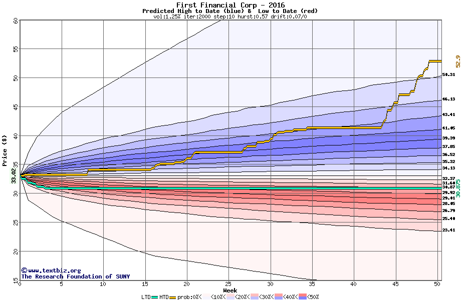 The high to date and low to date prices of the stock plotted against a random walk model for 2016 (what's this?).