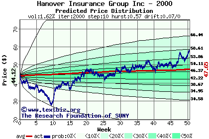 The high to date and low to date prices of the stock plotted against a random walk model for 2000 (what's this?).