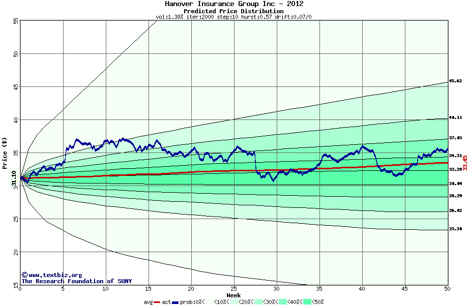 The following graph plots the year-to-date performance of the stock for 2012 compared to the probability calculated by a random walk model.
