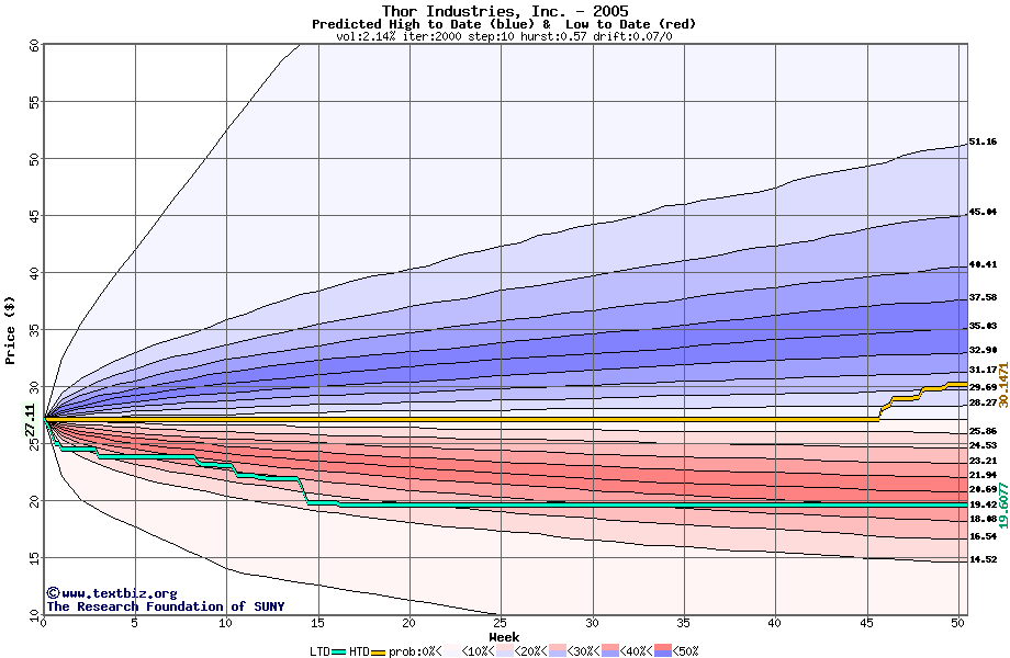 The high to date and low to date prices of the stock plotted against a random walk model for 2005 (what's this?).