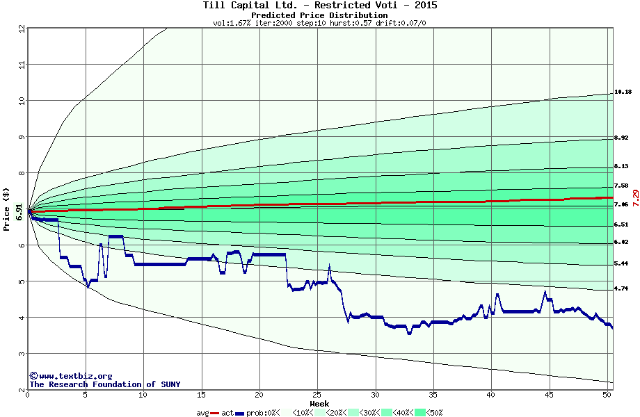 The high to date and low to date prices of the stock plotted against a random walk model for 2015 (what's this?).