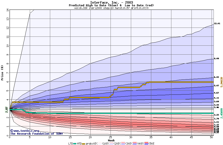 The high to date and low to date prices of the stock plotted against a random walk model for 2003 (what's this?).