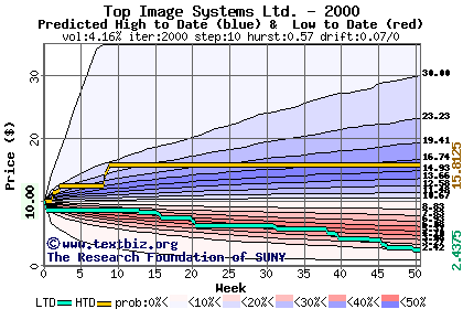 The high to date and low to date prices of the stock plotted against a random walk model for 2000 (what's this?).