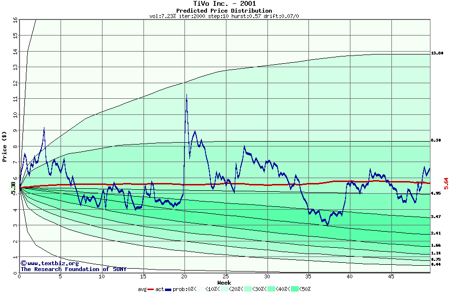 The following graph plots the year-to-date performance of the stock for 2001 compared to the probability calculated by a random walk model.