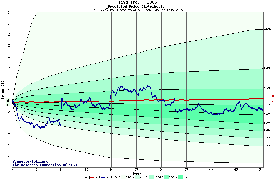 The following graph plots the year-to-date performance of the stock for 2005 compared to the probability calculated by a random walk model.