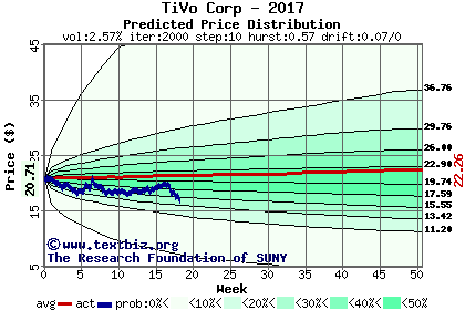 The high to date and low to date prices of the stock plotted against a random walk model for 2017 (what's this?).
