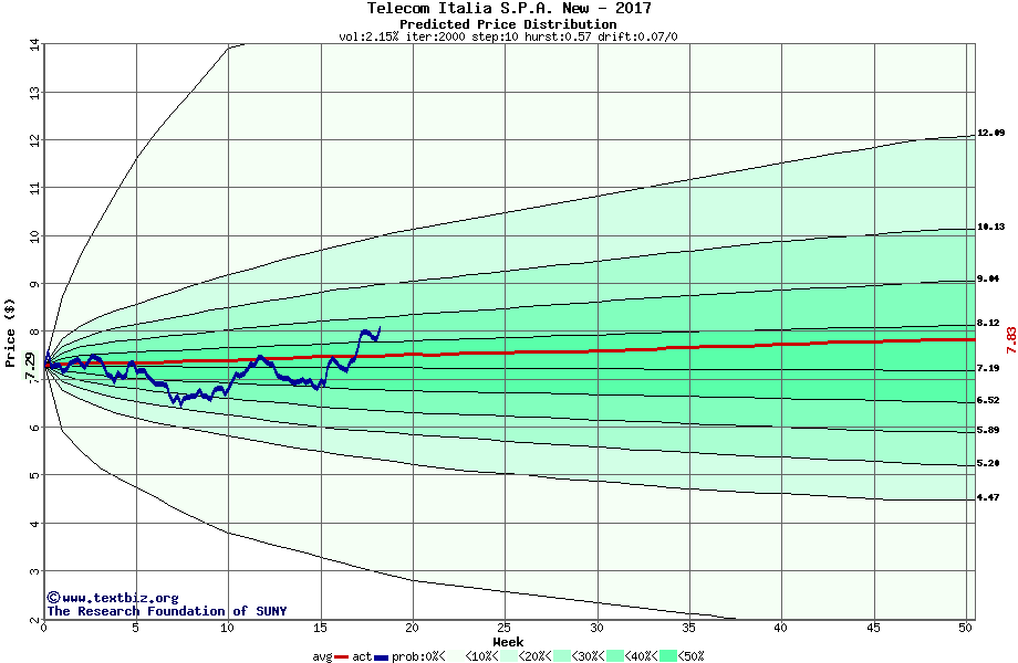 The high to date and low to date prices of the stock plotted against a random walk model for 2017 (what's this?).