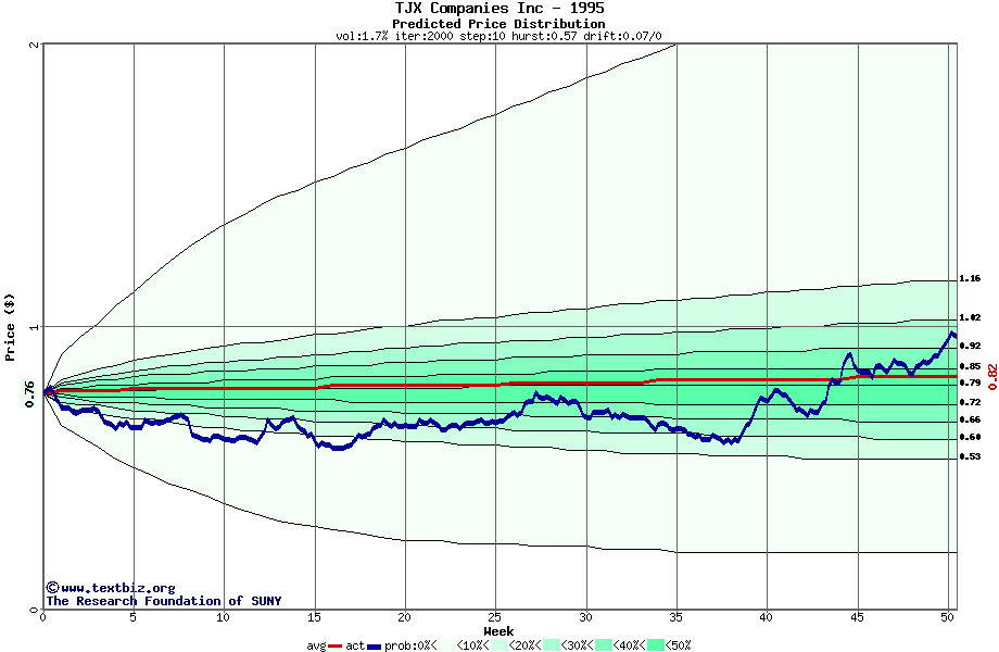 The following graph plots the year-to-date performance of the stock for 1995 compared to the probability calculated by a random walk model.