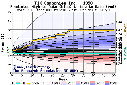 The high to date and low to date prices of the stock plotted against a random walk model for 1998 (what's this?).