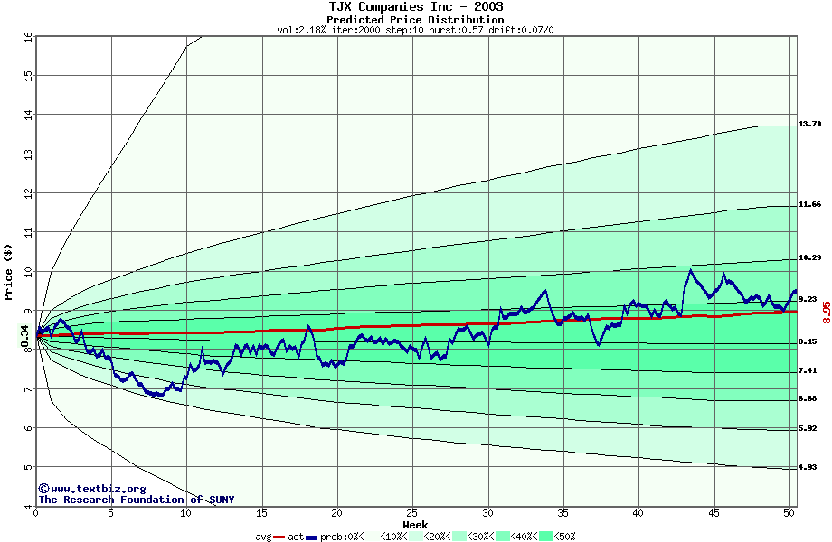 The following graph plots the year-to-date performance of the stock for 2003 compared to the probability calculated by a random walk model.