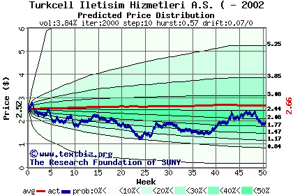 The high to date and low to date prices of the stock plotted against a random walk model for 2002 (what's this?).