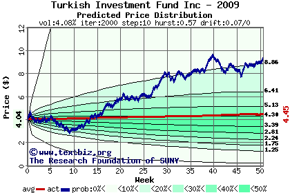 The high to date and low to date prices of the stock plotted against a random walk model for 2009 (what's this?).