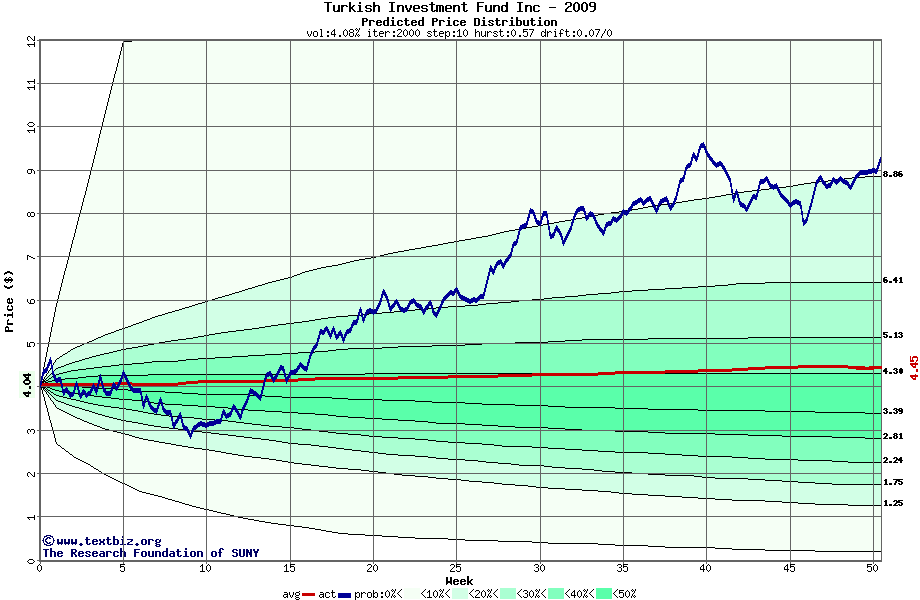 The following graph plots the year-to-date performance of the stock for 2009 compared to the probability calculated by a random walk model.