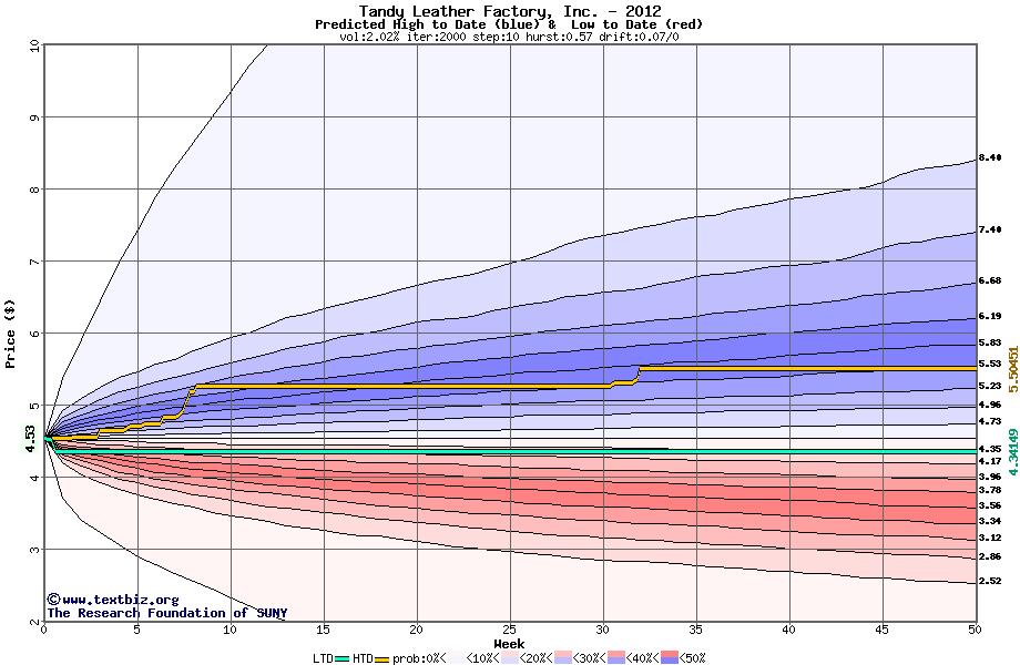 The high to date and low to date prices of the stock plotted against a random walk model for 2012 (what's this?).