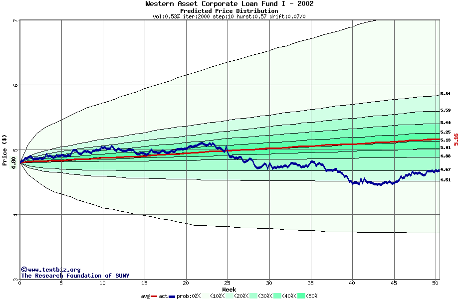 The high to date and low to date prices of the stock plotted against a random walk model for 2002 (what's this?).