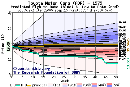 The high to date and low to date prices of the stock plotted against a random walk model for 1979 (what's this?).