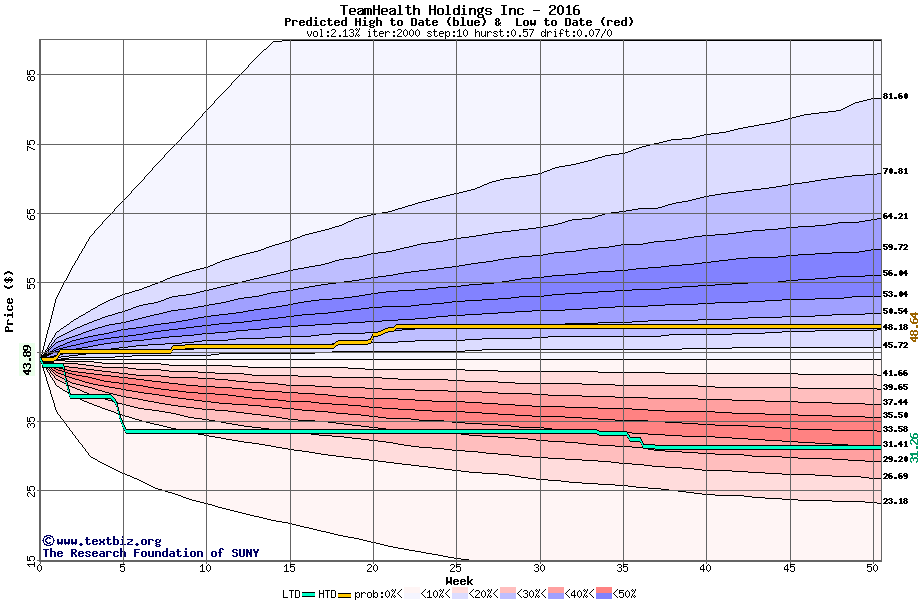 The high to date and low to date prices of the stock plotted against a random walk model for 2016 (what's this?).