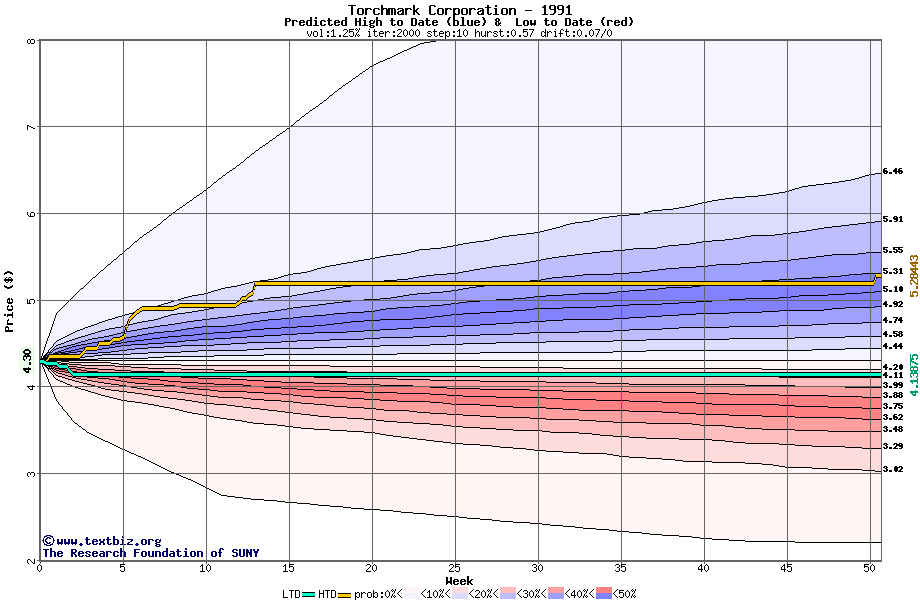 The high to date and low to date prices of the stock plotted against a random walk model for 1991 (what's this?).