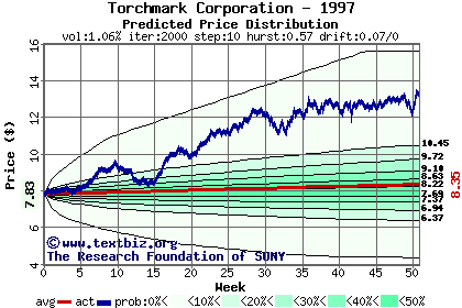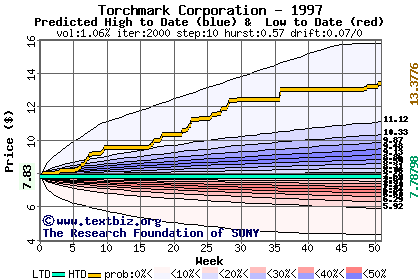 The high to date and low to date prices of the stock plotted against a random walk model for 1997 (what's this?).