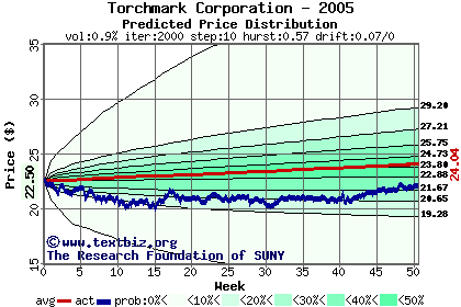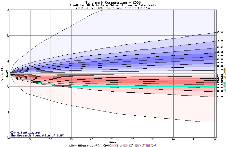 The following graph plots the year-to-date performance of the stock for 2005 compared to the probability calculated by a random walk model.