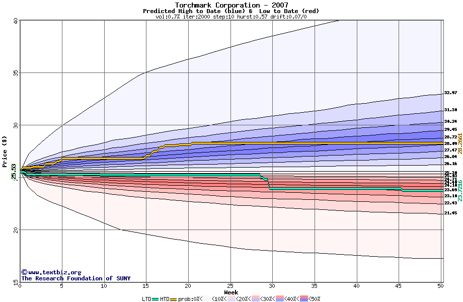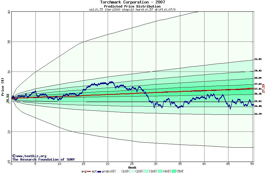 The following graph plots the year-to-date performance of the stock for 2007 compared to the probability calculated by a random walk model.
