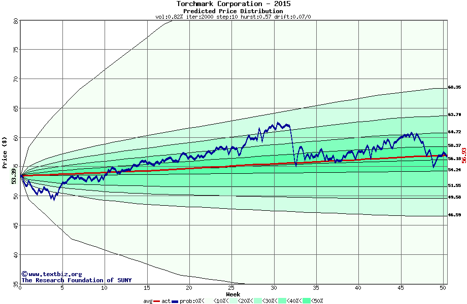 The following graph plots the year-to-date performance of the stock for 2015 compared to the probability calculated by a random walk model.