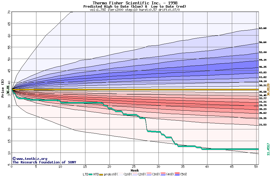 The high to date and low to date prices of the stock plotted against a random walk model for 1998 (what's this?).