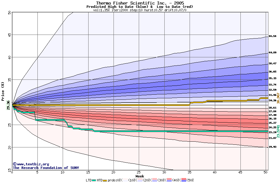 The high to date and low to date prices of the stock plotted against a random walk model for 2005 (what's this?).