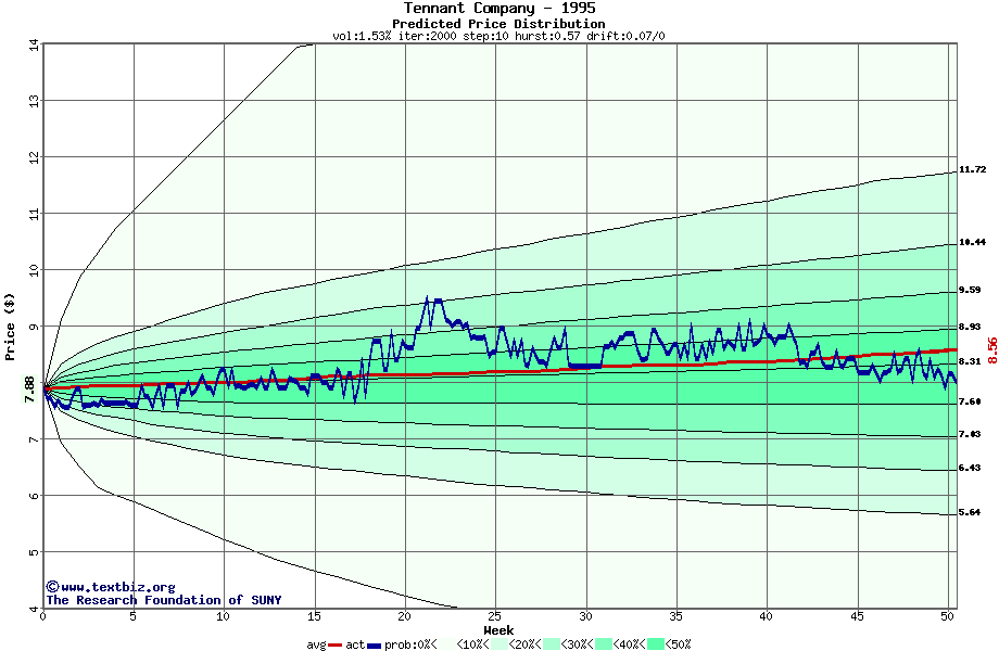 The following graph plots the year-to-date performance of the stock for 1995 compared to the probability calculated by a random walk model.