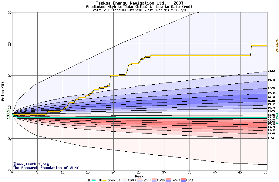 The high to date and low to date prices of the stock plotted against a random walk model for 2007 (what's this?).
