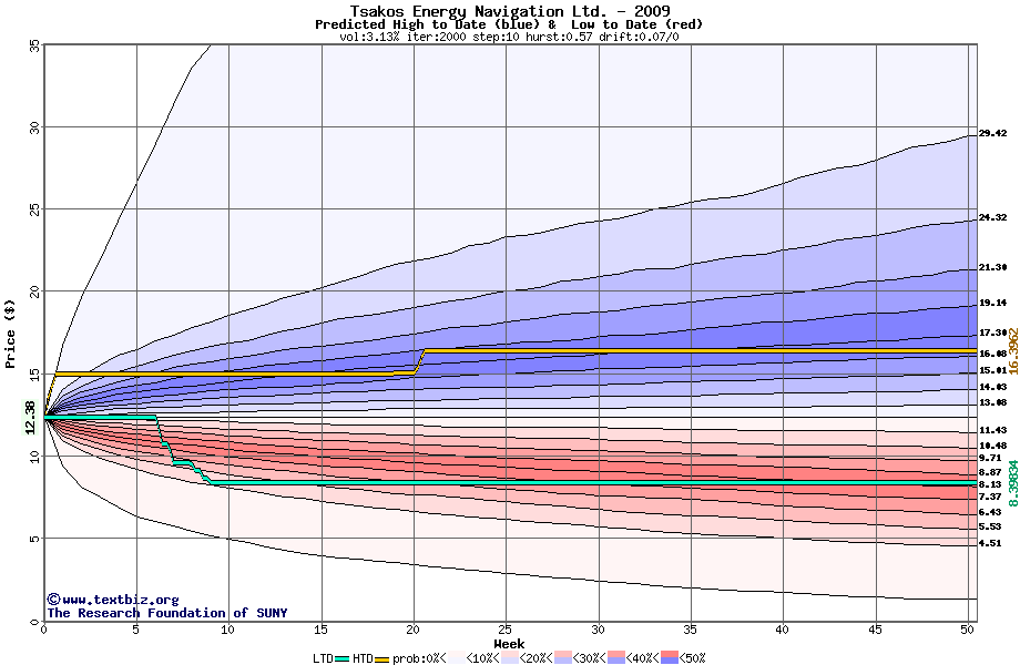 The high to date and low to date prices of the stock plotted against a random walk model for 2009 (what's this?).